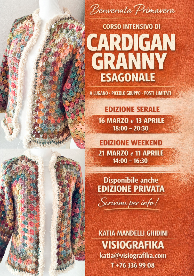 Il corso è dedicato alla costruzione di un cardigan granny esagonale (granny square cardigan), un modello versatile, moderno e completamente personalizzabile nei colori.