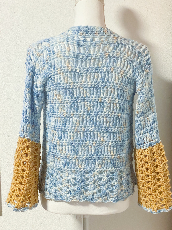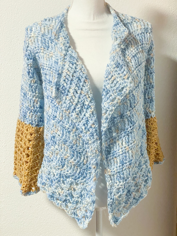 Il modello è creato con la tecnica topdown cioè dall’alto verso il basso e non vi sono cuciture, così da rendere il Cardigan azzurro pastello un capo morbidissimo e molto piacevole da indossare.