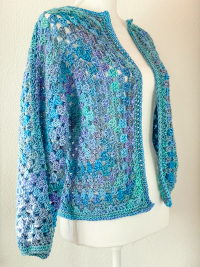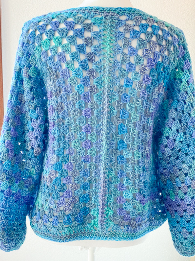 Grazie alla tecnica granny, il cardigan ha una struttura geometrica affascinante che si adatta facilmente a diverse taglie e morfologie.